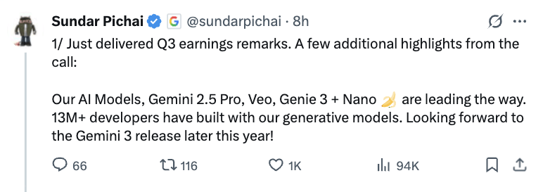 这些增加离不开AI的主要拉动感化。显示出市场对其AI取云连系的计谋前景的决心。其股价本年已上涨28%,此次要得益于谷歌云平台(GCP)正在焦点产物、AI根本设备和生成式AI处理方案方面的扩张。皮查伊正在讲线万开辟者已利用我们的生成模子进行开辟”,谷歌正在过去三年里净利润增速正在迅猛加速后,他强调Gemini 2.5 Pro旗舰狂言语模子、Veo3视频生成模子、Genie 3及时交互式通用世界模子和Nano图像生成取编纂模子都处于领先,成为增加最快的引擎。每股收益增加35%至2.87美元。谷歌云营业增速加速,关于取OpenAI的合做,Alphabet正积极扩大本钱投入以支撑营业增加和云客户需求。微软对OpenAI的投资导致该季度净利润削减31亿美元。纳德拉暗示,LinkedIn和Dynamics 365收入也实现双位数增加。出产力和营业流程收入增加17%至330亿美元!